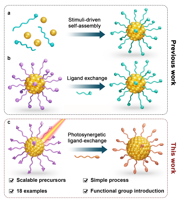 铜以其丰沛储量、低廉成本与独特物性,正日益成为纳米团簇研究中备受瞩目的焦点。然而,铜纳米团簇的模块化合成路径长期以来发展缓慢。当前铜纳米团簇的合成主要依赖于刺激驱动的“自下而上”组装法或传统配体交换策略,但这些方法常面临尺寸控制难、单分散性差、配体适用范围窄、交换不完全、前驱体不稳定等问题。铜纳米团簇的精准合成与结构调控一直是材料化学研究的重要挑战之一。