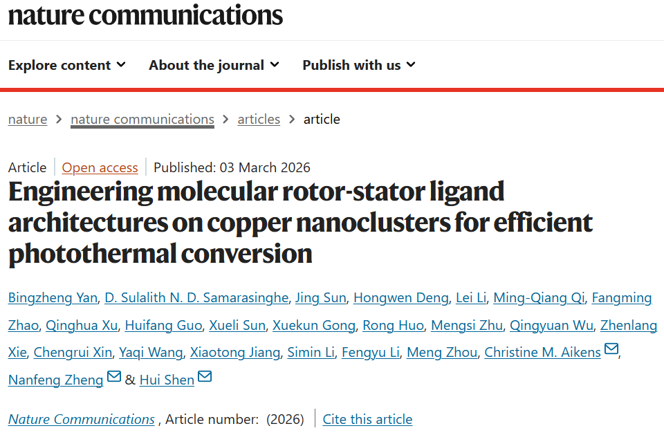 近日,beat365官网能源材料化学研究院沈慧团队在国际顶级期刊Nature Communications上发表研究论文“Engineering molecular rotor-stator ligand architectures on copper nanoclusters for efficient photothermal conversion”,这是该团队在一个月内连续发表的第二篇Nature子刊文章。