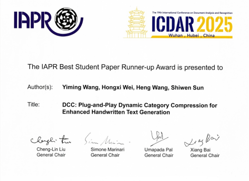 At the International Conference on Document Analysis and Recognition (ICDAR) 2025, two papers co-authored by Professor Wei Hongxi and his Ph.D. student Wang Yiming from the School of Artificial Intelligence, Inner Mongolia University, received prestigious awards, marking a significant achievement for the university in the field of document analysis and recognition.