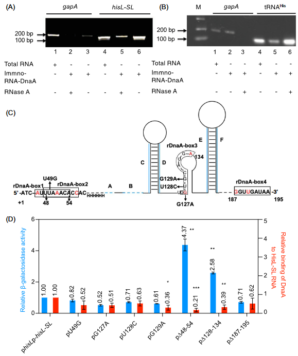 The research studies the molecular mechanism for transcription attenuation with the his operon of Gram bacteria. It is found that the transcription attenuation of his operon is dependent on DnaA and HIS l-SL(hisL-stem loop region) and RNA; and DnaA might regulate the transcription of the structural gene hisG, but not that of the leader gene hisL. Then on the basis of this finding, with RNAIP(immunoprecipitation) it is found that HisL-SLRNA and DnaA are coprecipitated while HisL-SLRNA and gapA-RNA are not(Fig. 1A). Interestingly, rDnaA-boxes1,2,3,4 are identified in HisL-SL RNA while rDnaA-box is not identified in gapA-RNA-the same result with RNA IP and the HisL‐SL RNA and rDnaA boxes are phylogenetically conserved in Gram‐negative bacteria. The lack of RDnaA-boxes1,2 and 3 weakens the interaction of HisL-SL RNA with DnaA to improve the transcription of his operon while the lack of rDnaA-box4 does not influence the interaction with DnaA and the transcription of his operon(Fig.1C, D).