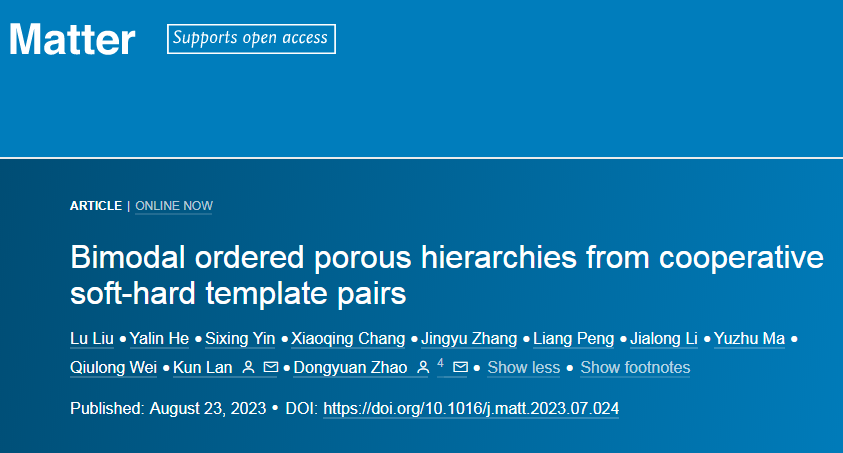 The team of Academician Zhao Dongyuan of Fudan University/IMU published the result of their research in Matter with the title Bimodal Ordered Porous Hierarchies from Cooperative Soft-hard Template Pairs on August 23, 2023.