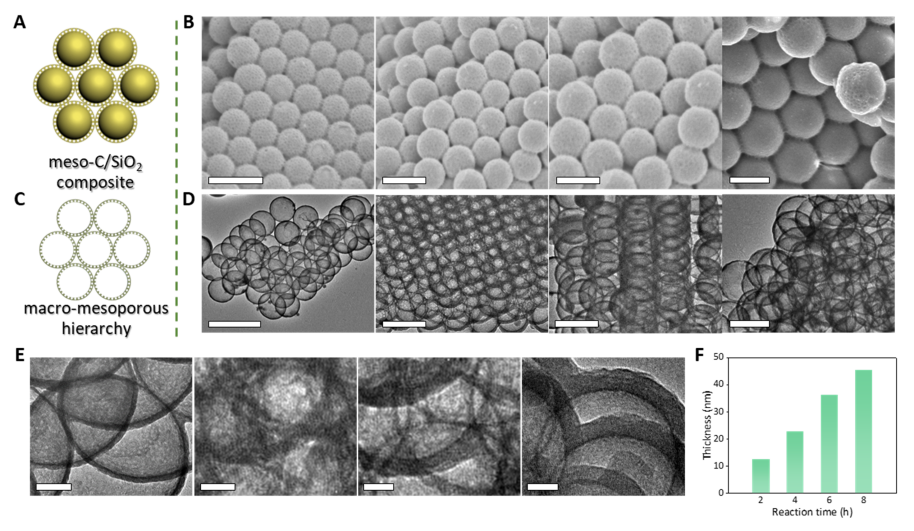 In the process of their studies, the team of Academician Zhao Dongyuan proposed a soft-hard cooperative hierarchical assembly method by which mesoscopic structures with multiple orderliness can be built by assembling the two structure units, i.e. soft micel (tri-block copolymer pluronic F127/polydopamine) and the hard rigid particles (SiO2 nanosphere) in turn into ordered mesoscopic structure and photon crystals. The introduction of SiO2 hard plates can not only tactfully avoid the incompatibility of soft-soft pairs and produce ordered colloid crystals, but also retains its full interaction with F127/polydopamine, thus ensuring the formation of bi-peak ordered structure. The multi-layer porous structure thus produced has excellent porosity (with high specific surface area of 286m²°g-1 and pore volume of 0.31 cm³ g-1) and high binary orderliness in mesoscopic and macroscopic dimensions. In addition, the macropore-mesopore carbon thus obtained exhibits excellent override, circulation property and rapid pseudocapacitance and charge transfer dynamics in sodium ion storage.