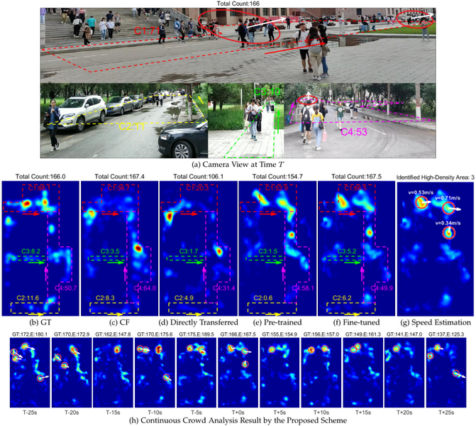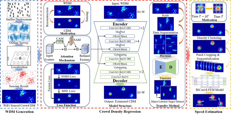 Due to this, the research proposes a passive WiFi sensing based fine-grained crowd analysis scheme. On the basis of the deep analysis of the limitations of the sensing and introduction of the rich-information density maps in the field of computer vision to accurately describe the density distribution of the crowd, the research designs an attention-based deep convolutional autoencoder (ADCA) to recover accurate crowd density maps from the sensing data in a way similar to image reconstruction. The research also designs an approach which is based on the combination of density clustering and bidirectional convolutional long-term and short-term memory networks to infer local high-density crowds (LHDCs) speeds with the features of spatial-temporal changes of local density of crowd states. The research develops a probabilistic model-embedded divide and conquer algorithm to produce the semi-synthetic datasets with the generalization of key law of realistic sensing behavior in pedestrian tracking data to fully train, effectively evaluate and transfer the scheme across the domains.