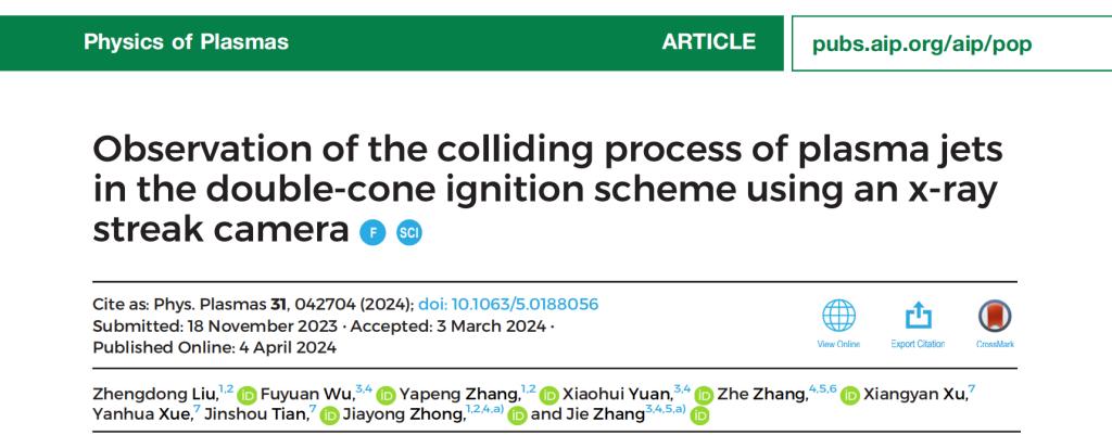 近日,beat365官网物理科学与技术学院刘正东博士研究成果《Observation of the colliding process of plasma jets in the double-cone ignition scheme using an x-ray streak camera》成功入选等离子体国际权威期刊《Physics of Plasmas》2024年度《Early Career Collection》专刊(入选公告链接:https://doi.org/10.1063/5.0266708)。该专刊致力于遴选全球青年学者最具前瞻性的研究成果,入选论文需经国际同行严格评审。刘正东博士的成果获得专刊收录,标志着我国在高能量密度物理与聚变能源领域的研究已跻身国际前沿,并赢得学术界广泛认可。该论文由刘正东博士担任第一作者,吴福源副研究员为共同第一作者,北京师范大学仲佳勇教授和上海交通大学张杰院士共同担任通讯作者。
