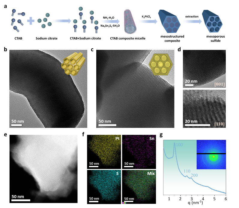 本文提出了一种新颖的协同离子自组装方法,成功合成了高度有序的介孔Pt2Sn2S6网络。具体来说,这种介孔结构的双金属硫化物可以在温和搅拌的水溶液中组装。这种介观结构构建的关键不仅在于阳离子表面活性剂和阴离子硫源的强粘附力以提供兼容的相互作用,而且室温下配体辅助的条件能够延缓高反应性金属和硫离子的严重沉淀,从而在这种情况下赋予了兼容和适度的组装化学性质。优化后的介孔Pt2Sn2S6在电催化析氢反应(HER)中展现出卓越的性能。该研究为合成难以通过常规自组装方法组装的新型功能介孔组分提供了一条新途径,也为先进的能源相关应用提供了巨大的可能性。
