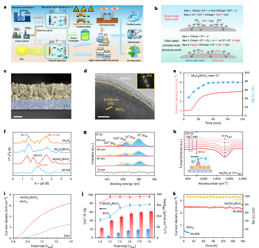 研究团队提出了一种具有Cl-介导的新型光电极NbClOₓ/BiVO₄,能够直接从天然海水中光电化学合成消毒剂。该电极的起始电位为0.6 VRHE,次氯酸盐法拉第效率接近100%,产率高达119.9 µmol cm⁻² h⁻¹,并具有超过500小时的稳定性。阴极同步生成Mg(OH)₂、CaCO₃和氢气,软化海水。这项技术通过NbClOx催化剂对海水中Cl⁻的定向介导和OH⁻的动态调控,在原子尺度上精准实现了OH*/Cl*活性物种的吸附-活化-转化路径协同,突破了传统氯碱工艺依赖氯气中间体的技术瓶颈。这一机制创新不仅从源头上规避了有毒氯气的生成风险,更在弱碱性海水环境中直接合成高价值消毒剂,将复杂多步反应简化为一步绿色电合成,为氯碱工业提供了“资源-反应-产品”全链条低碳化的颠覆性技术范式。