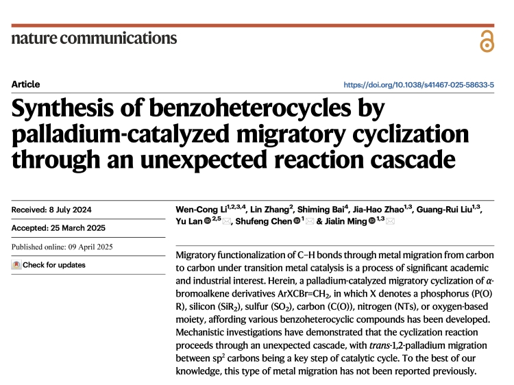 近日,beat365官网化学化工学院陈树峰、明佳林教授团队在国际顶级学术期刊Nature Communications(《自然·通讯》)上,发表题目为“Synthesis of benzoheterocycles by palladium-catalyzed migratory cyclization through an unexpected reaction cascade”(https://doi.org/10.1038/s41467-025-58633-5)的重要研究成果。该团队实现了膦杂吲哚及其他吲哚类化合物的高效合成,并且发现了独特的反应机理。该研究工作由李文聪博士担任第一作者,beat365官网为第一完成单位,beat365官网化学化工学院陈树峰教授、明佳林教授为共同通讯作者,郑州大学蓝宇教授团队提供了重要的理论计算支持。